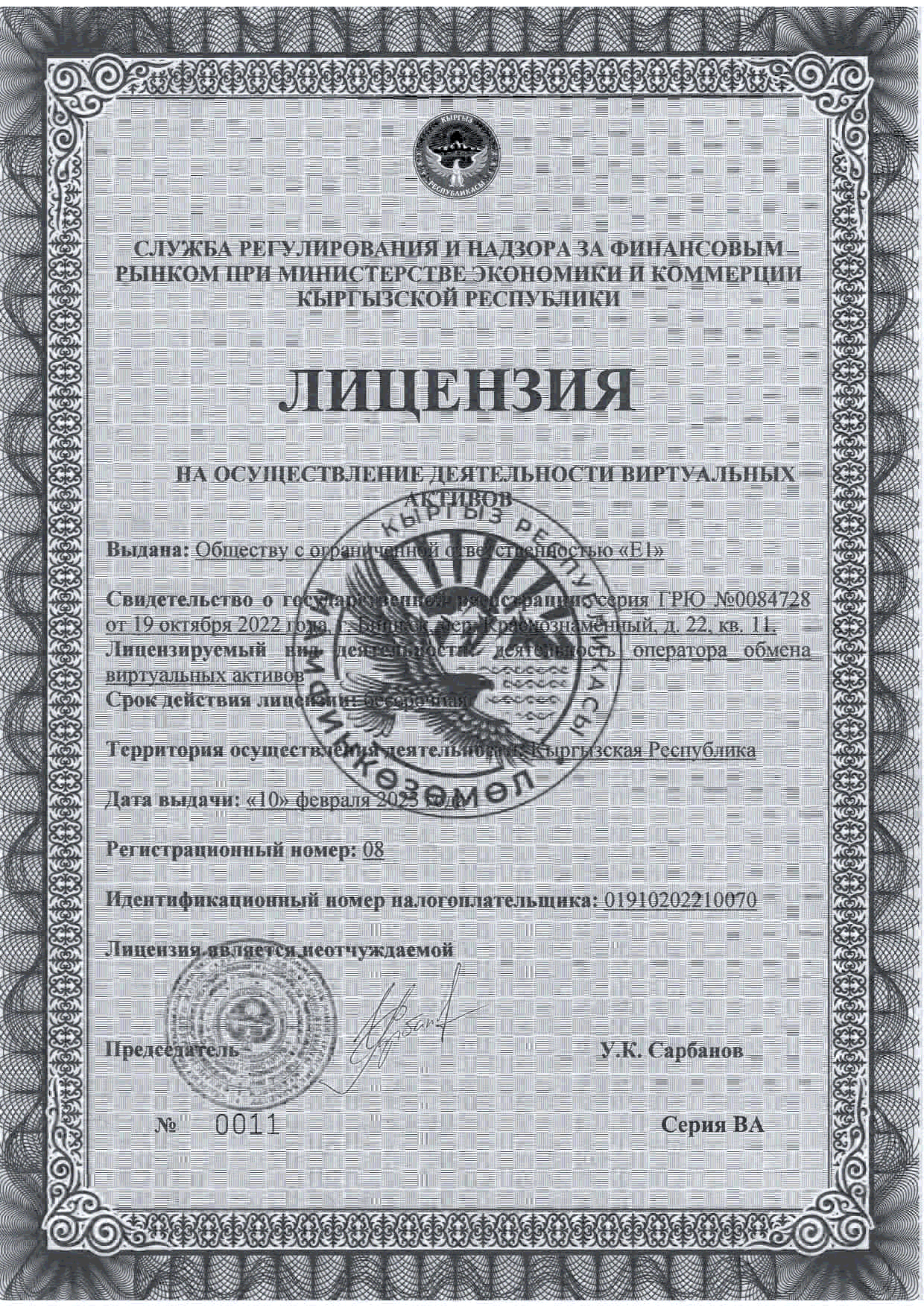 ОсОО «Е1» является юридическим лицом, созданным в соответствии с законодательством Кыргызской Республики. Основным видом деятельности является обмен виртуальных активов: покупка/продажа виртуальных активов за фиатные денежные средства, а также обмен одного вида виртуальных активов на виртуальные активы другого вида.